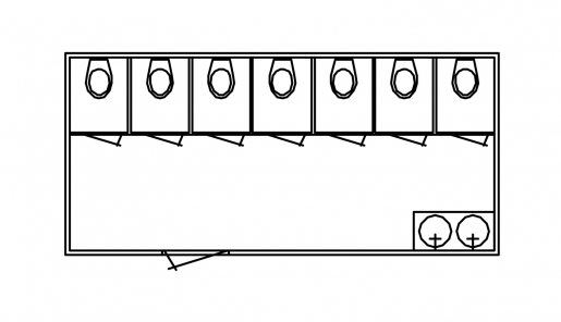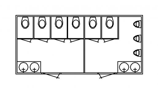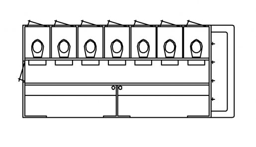 - Toiletunit met 7 toiletten, 2 plasgoten en 1 wastafel met 4 kranen op kopse kant van de unit